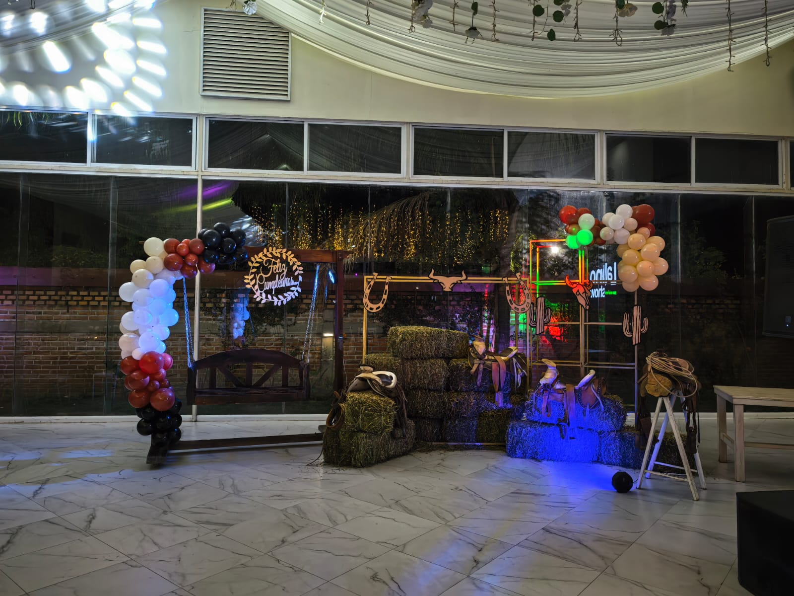 decoración mixta con telares, estructuras y otros elementos