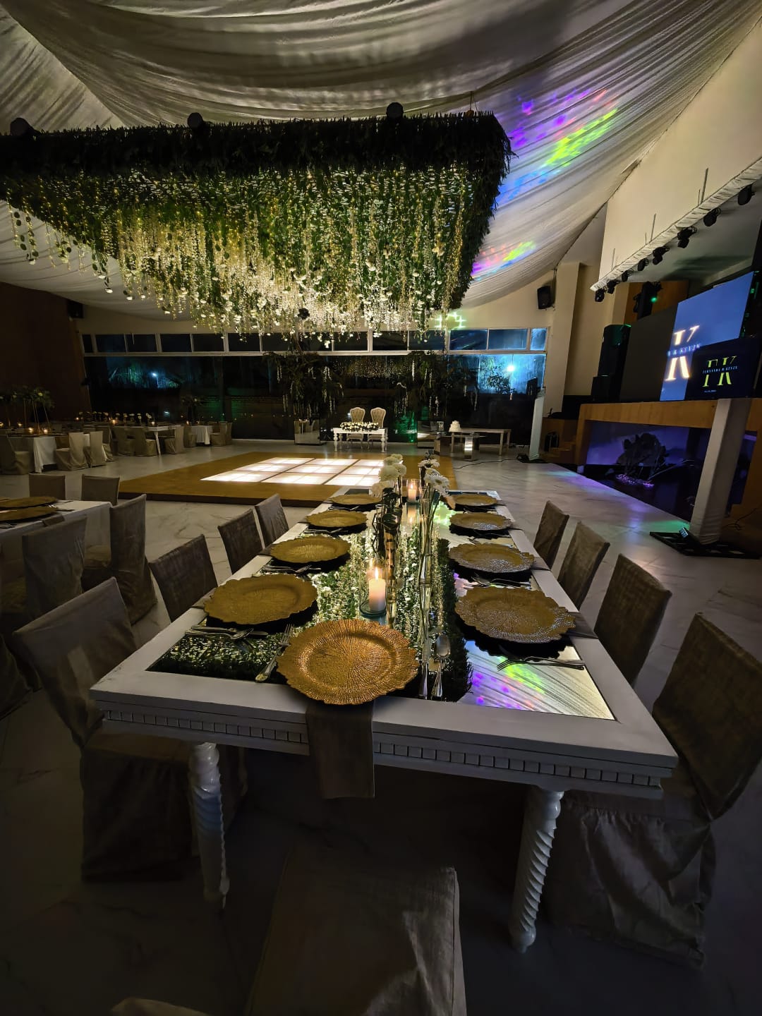 - con escenario incluido telares en techo y estructura decorativa colgante sobre pista de baile.